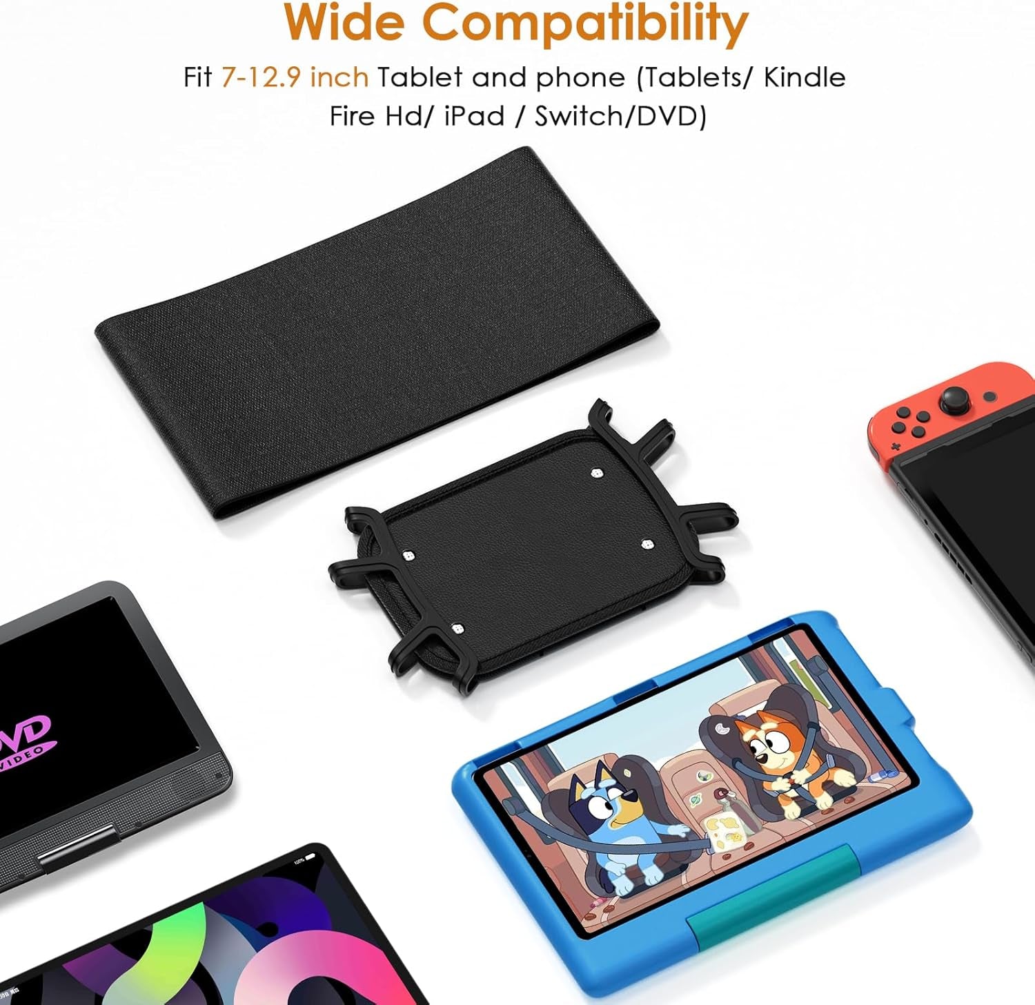 🚓【Compatible with All 7-12.9inch Tablets】New upgraded Car headrest mount holder is compatible with 7"-12.9" Tablets/iPhone/iPad/iPad mini/Samsung/Kindle/Fire HD and more devices. Adjustable headrest strap to install with different size car backseat headrests horizontally or vertically, which is suitable for most cars.